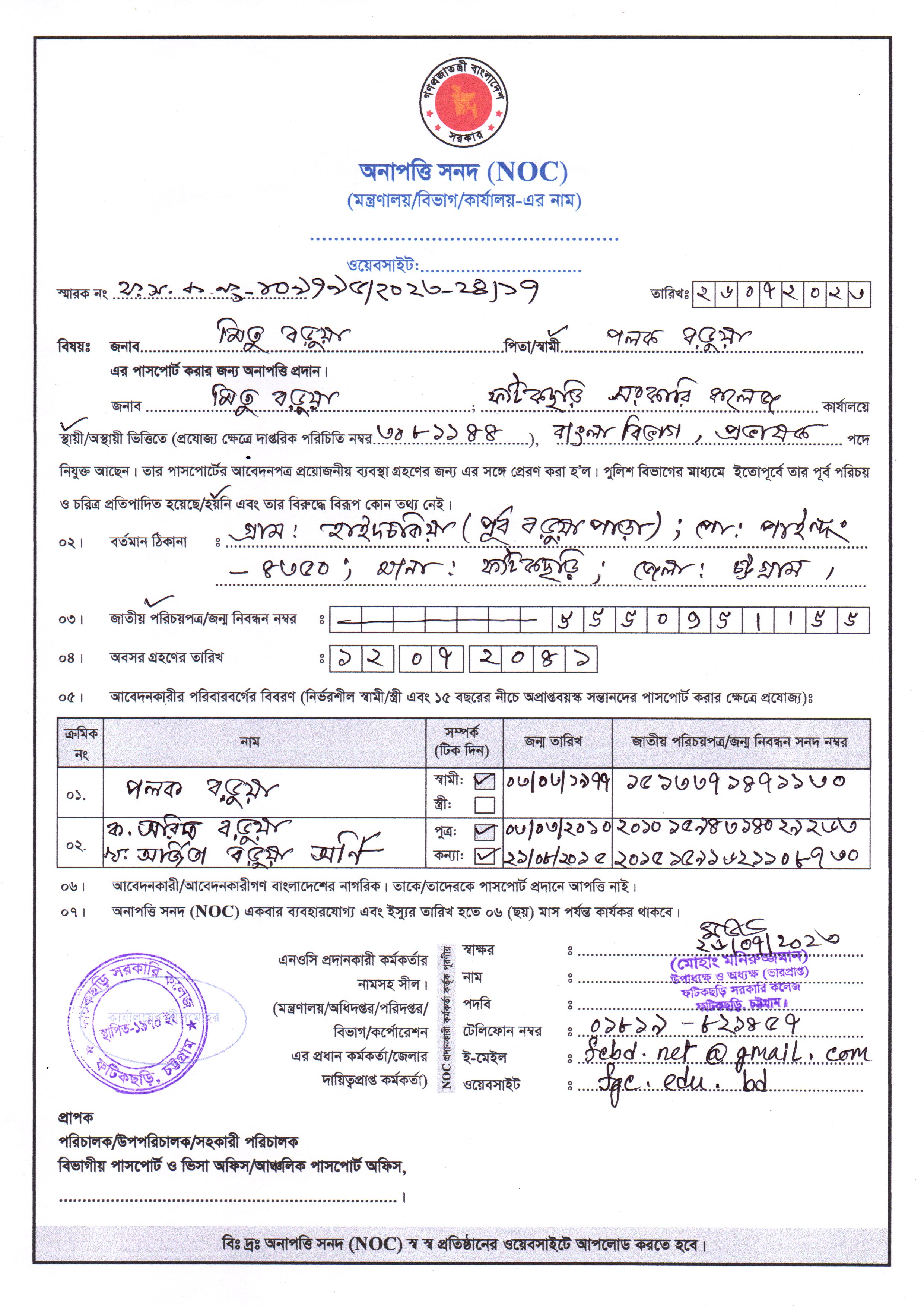 NOC for Mrs. Mitu Barua Lecturer, Bangla Department.