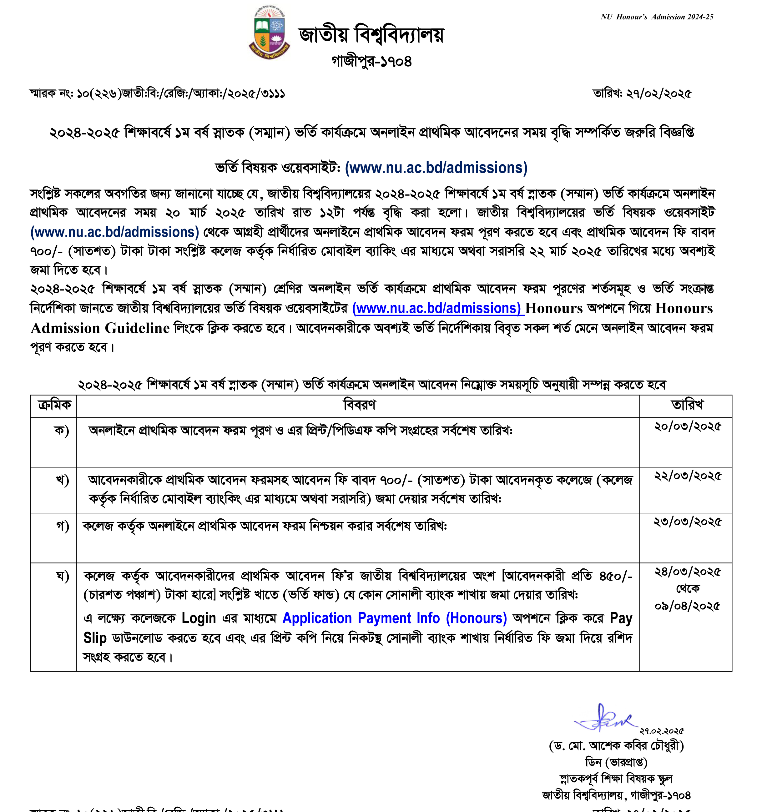 HONS Admission: Primary Application Time Exten.