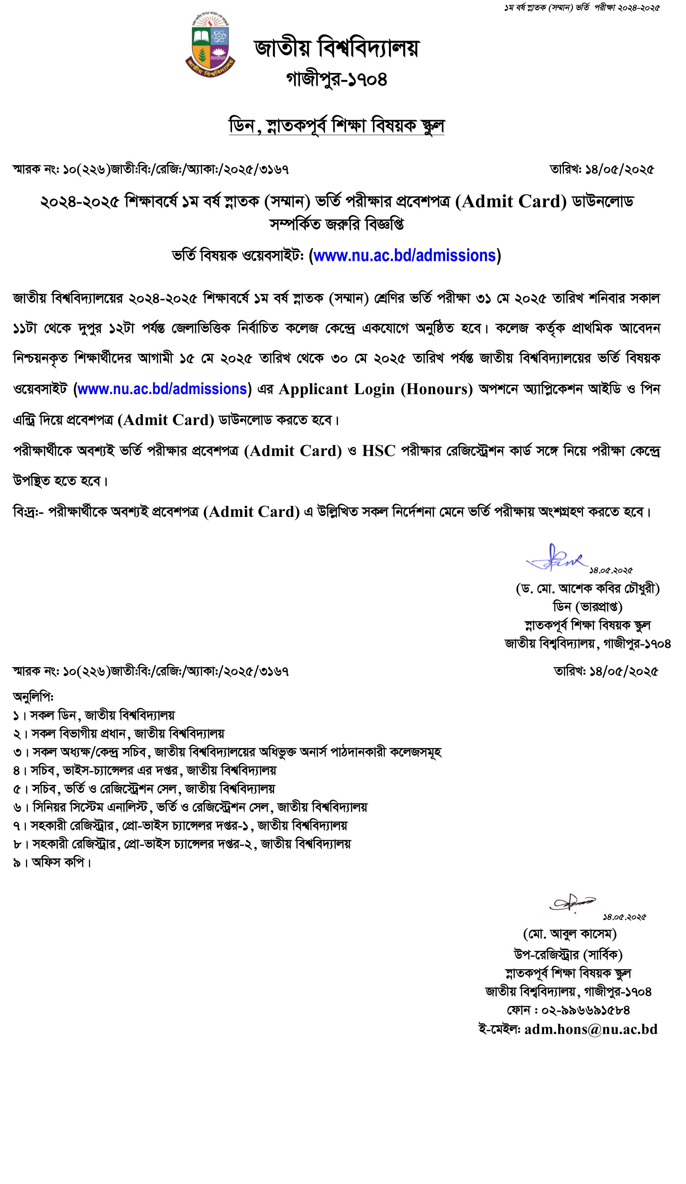 HONS Admission Test Admit Card Download
